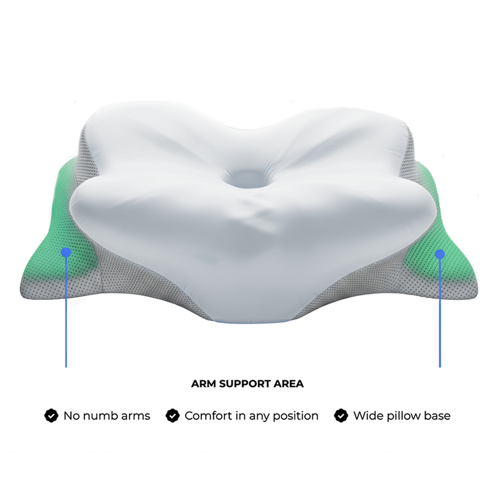 "I have cervical stenosis and always struggled to sleep flat. The raised wings on this pillow keep everything aligned. My numbness and tingling are much better now."